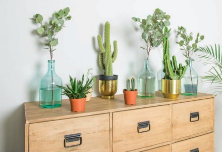 Wyjątkowo efektownie prezentuje się we wnętrzu jeden, pojedynczy, ale za to pokaźnych rozmiarów kaktus. Jeśli chcemy oprzeć dekoracje na takim rozwiązaniu, doskonale w tej roli znajdzie się wilczomlecz trójżebrowy. I choć w istocie kaktusem nie jest, chociaż należy do tej samej rodziny sukulentów, nic mu to nie ujmuje – kolumnowy pokrój i kolce mówią same za siebie. Dość szybko przyrasta, wytwarza grube mięsiste pędy, pokryte wzdłuż brzegów ostrymi, krótkimi cierniami oraz drobnymi, rzadko rozmieszczonymi, owalnymi listkami. Posadzony w dekoracyjnej donicy wygląda we wnętrzu niezwykle majestatycznie i buduje jego klimat.